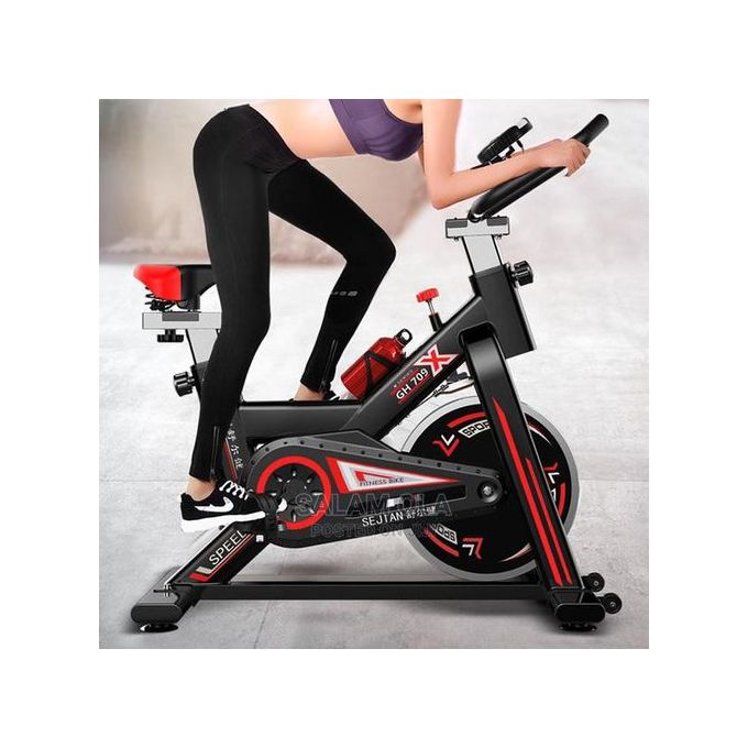 A stationary bicycle is a device used as exercise equipment for indoor cycling. It includes a saddle, pedals, and some form of handlebars arranged as on a bicycle. A stationary bicycle is usually a special-purpose exercise machine resembling a bicycle without wheels.
